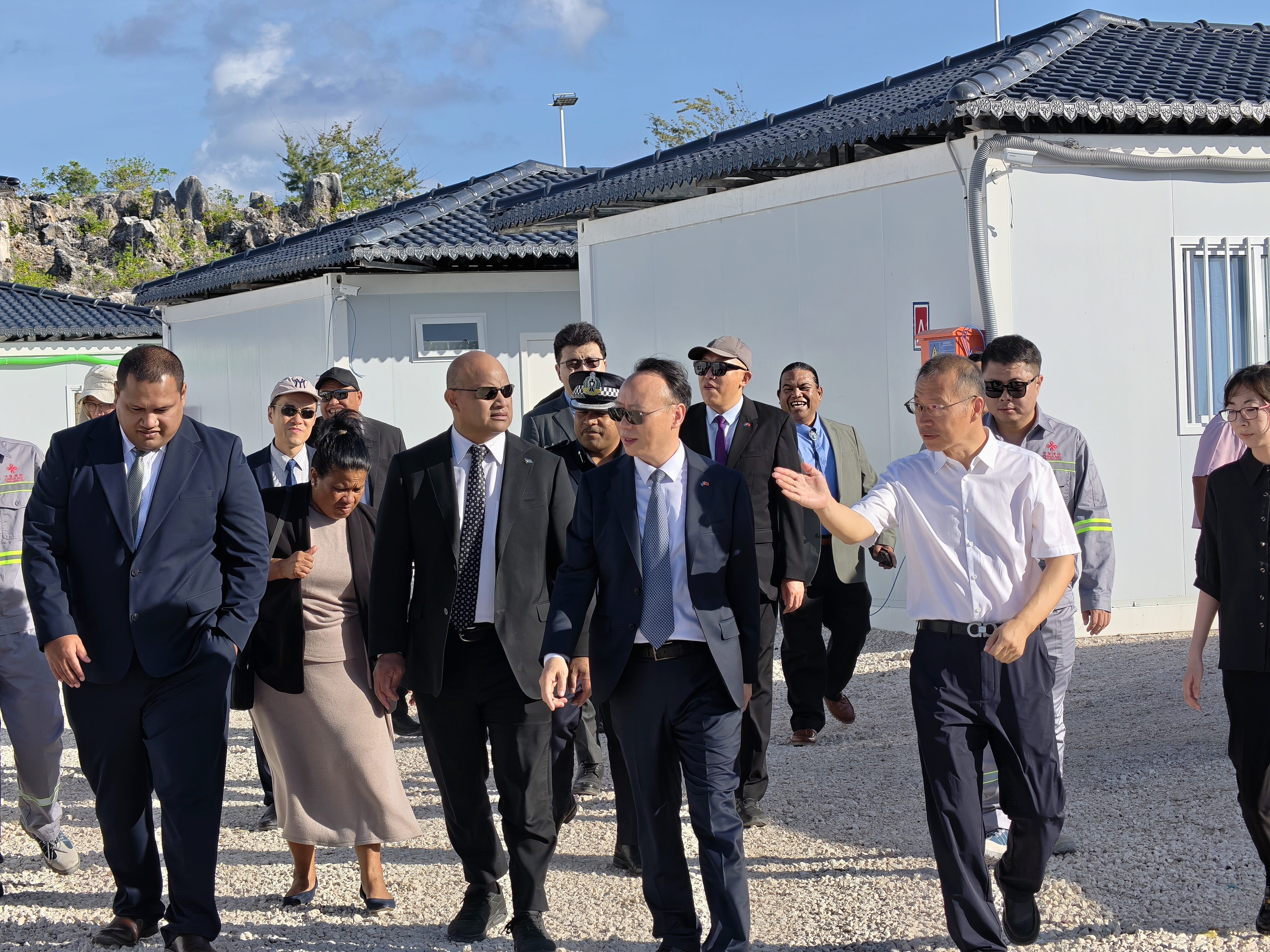 阿迪昂一行深入项目工地,实地考察了核心施工区域、水泥搅拌站、办公营地及职工宿舍等功能区,对现场井然有序的施工组织、规范的人员操作及短时间内取得的建设成效表示高度赞赏,特别感谢中国政府所给予的无私援助与支持,并对建设团队克服困难、高效推进项目所展现的专业精神与卓越执行力给予充分肯定。他表示,亲眼看见项目在短时间内取得实质性进展令人振奋。瑙方对项目如期建成、早日投入使用充满信心,在中国朋友的真诚帮助下,瑙鲁人民即将实现拥有现代化体育场的长久梦想。